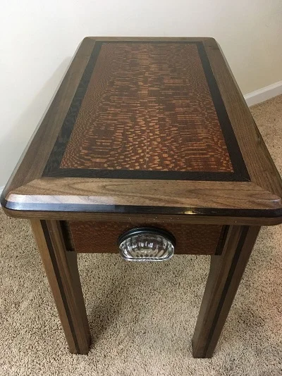 The end table made from leopard wood, wenge, and walnut provides a visual experience but is built to use and last a life time. Framing the leopard wood with wenge creates a picture you want to keeping viewing.